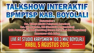 Talkshow Spesial dari BPMPTSP Kab. Boyolali Narasumber : 1. Drs. Widoyo (Kabid Pelayanan Investasi) 2. Drs. Eko Nugroho, MM (Kasubbid Pengendalian) 3.